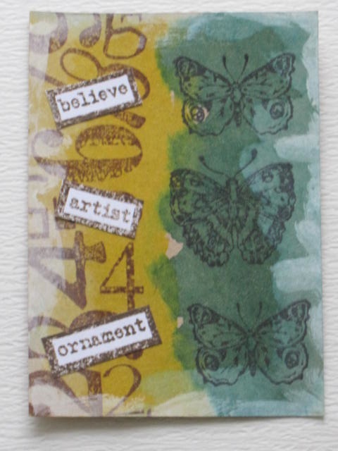 今日のカードはbutterflyのATCです。Stampington & Coのstampers' samplerという雑誌のfebrury/march 2012を参考に作成しました。使用ペーパー:普通紙、モダンクラフト紙使用スタンプ:ALL NIGHT MEDIA、Stampotique Originals、Unity Stamp Co.使用インク:DistressInk、アクリル絵具