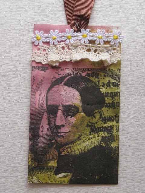 今日のカードはStamp SmithのFabulous facesのスタンプを使ったタグです。使用ペーパー:普通紙使用スタンプ:Stamp Smith、Stampers Anonymous(Tim Holz Collection)使用インク:DistressInk、MEMENTO、アクリル絵具その他:マスキングテープ、レース、Dew Drops