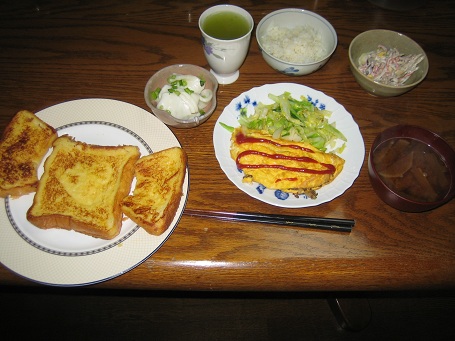 今日はニューミニの車検をユーザー車検で通したり、この前作った携帯電話用カバーに付いた傷の補修などやっていたら日が暮れてしまった。それぞれで日記が書けるぐらい充実した1日だったけど今日のテーマはお料理教室♪新しい事を始めたくて携帯カバーを塗装したり、週1ペースで料理を始めている。今まで作ったのはおにぎり、四角い卵焼き、目玉焼き、鳥の唐揚げ、お味噌汁、オムレツ、フレンチトースト。ド素人が四苦八苦しながら作っていますけど気持ちは“目指せ料理の鉄人!”と景気のいい事言いたいですけど既に作り方を思い出せないのも出てきたので自分用防備録としてアップ(^^;;本日作ったオムレツ、キャベツの炒めたものにフレンチトースト。(フレンチトーストは明日の朝食用)・オムレツ 1. タマネギをみじん切り 牛肉or合挽肉をつぶしながら炒める(途中塩コショウ) 頃合いを見てタマネギを肉と1対1になるぐらい入れて軽く塩コショウして炒める 中身完成 2. 卵を今日は2個フライパンで焼く 固まってきたら肉タマネギを卵の片側に置く 中身を置いてないほうをひっくり返して完成・フレンチトースト 1. パットに卵を1つ落としてかき混ぜる 牛乳少々、ミルク(コクが出るらしい)、砂糖を入れかき混ぜる 2. パンを2枚浸す(時間をおいてひっくり返し、全てパンに吸わせる) 3. フライパンで焼いておしまい食べてみての感想フレンチトーストは美味しかっただがオムレツは見た目は良かったけど味はダメまず中身を卵に載せる時にマゴマゴして焼きすぎたためか卵が固い!ゴワゴワした触感で不満足次回への課題です(>o