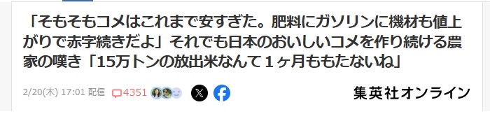 以前から思っていることだけど、都会の方々には農産物の価格について、もう少し理解して欲しい。マスコミの報道も問題があるとは思うけど、例えばキャベツの価格が例年の2倍とかなっても、何百円の話だよね。他を少し節約すれば何とかなる価格だよ。コメだってそうだ。そのうち金があっても、買えない時代がくるぞ (-_-;)