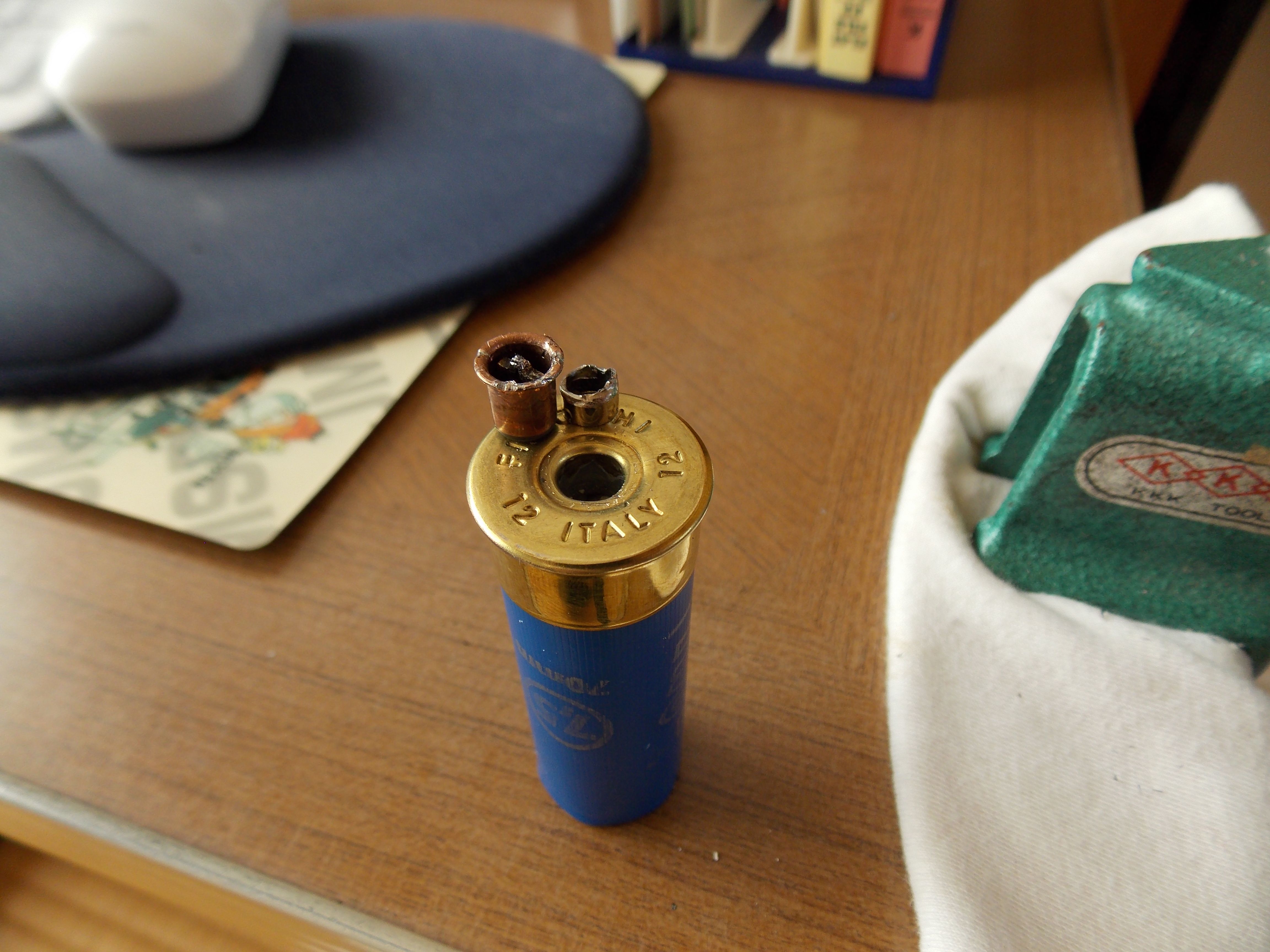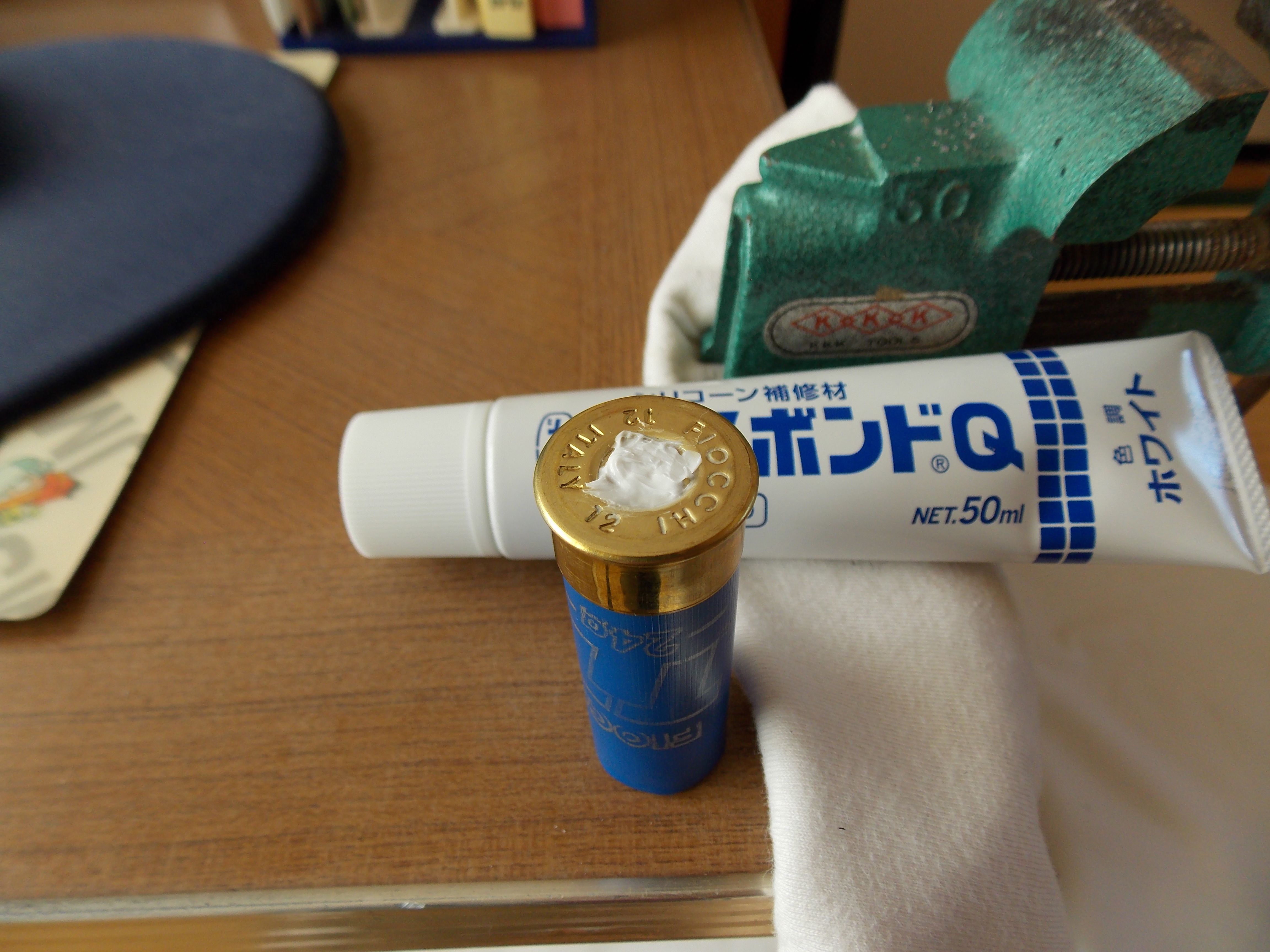 ヤフオクで射撃後の空薬莢を再クリンプ(開いた口を再度閉じること)したものを入手し、それを利用しました。