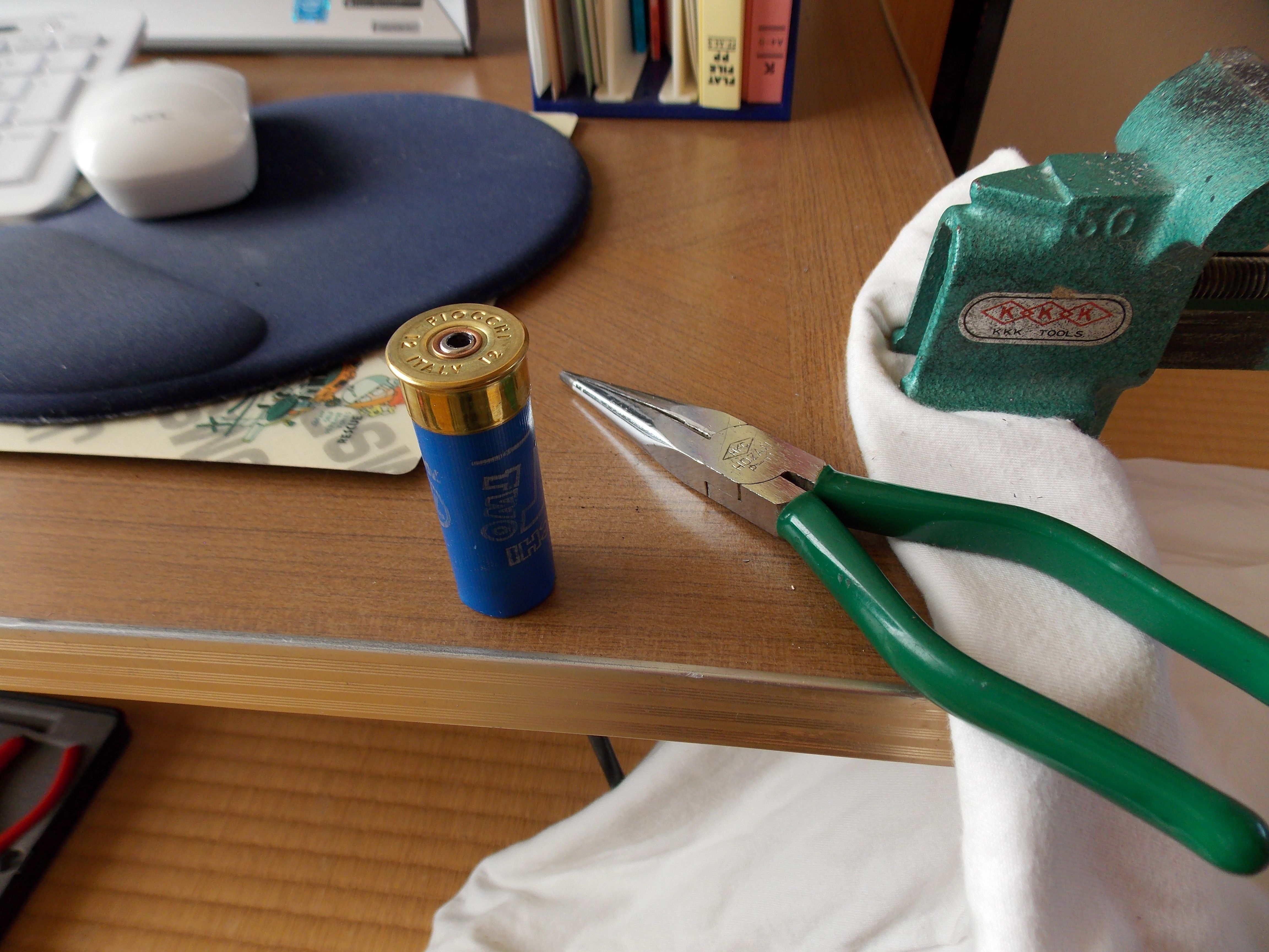 まず、雷管を外します。普通だったら口の方から打ち抜くのが早いのですが、再クリンプしてあるので、ドリルで穴を開けて取り出します。(他にも方法があるかもしれませんが、思いつきませんでした。)