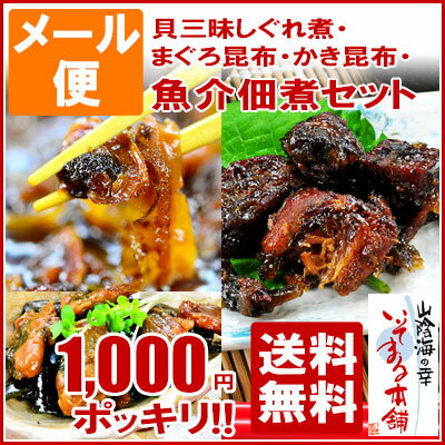ご飯が進みそう。3袋セット。1000円。メール便送料無料。 ポイント5倍 1,000円ぽっきり!<br>マグロ佃煮 牡蠣佃煮 貝三昧しぐれ煮 魚介佃煮セット!<BR>まぐろ昆布・カキ昆布・貝三昧<br>( 赤貝・ホタテのひも・アサリ ) 合計3袋セット<br>メール便 限定 送料無料<BR>