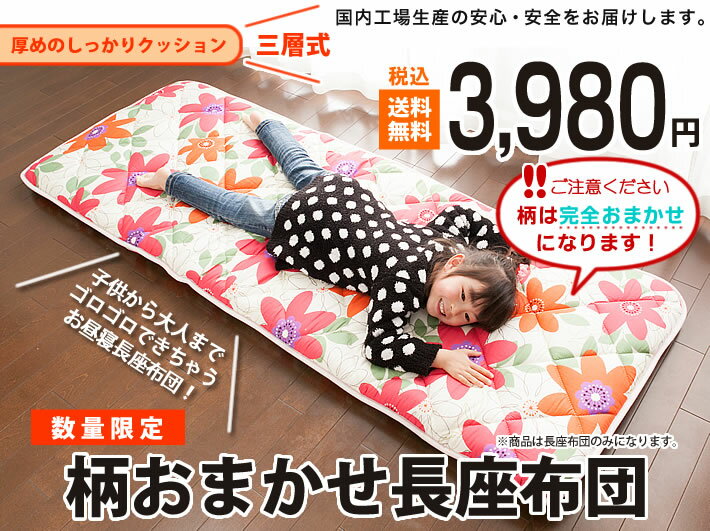 ランキングで気になった商品。長い机利用しているので長座布団欲しかった。ゴロ寝できるし、ソファー派の方はカバー替わりに使えます。大人も子供も楽しめる座布団、いかがですか?3980円。送料無料P2倍 長座布団 座布団 ごろ寝マット 70×180センチ 固綿 三層 三層構造 日本製 柄おまかせ長座布団【数量限定】【送料無料】