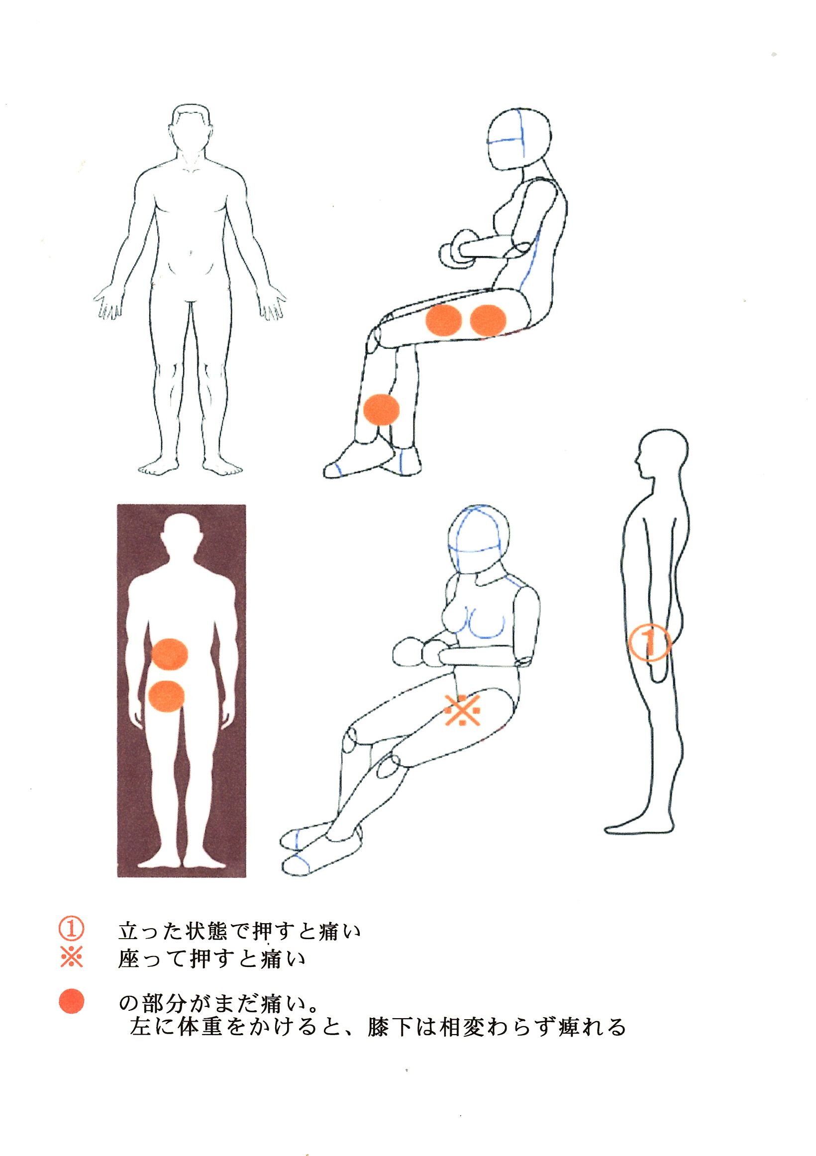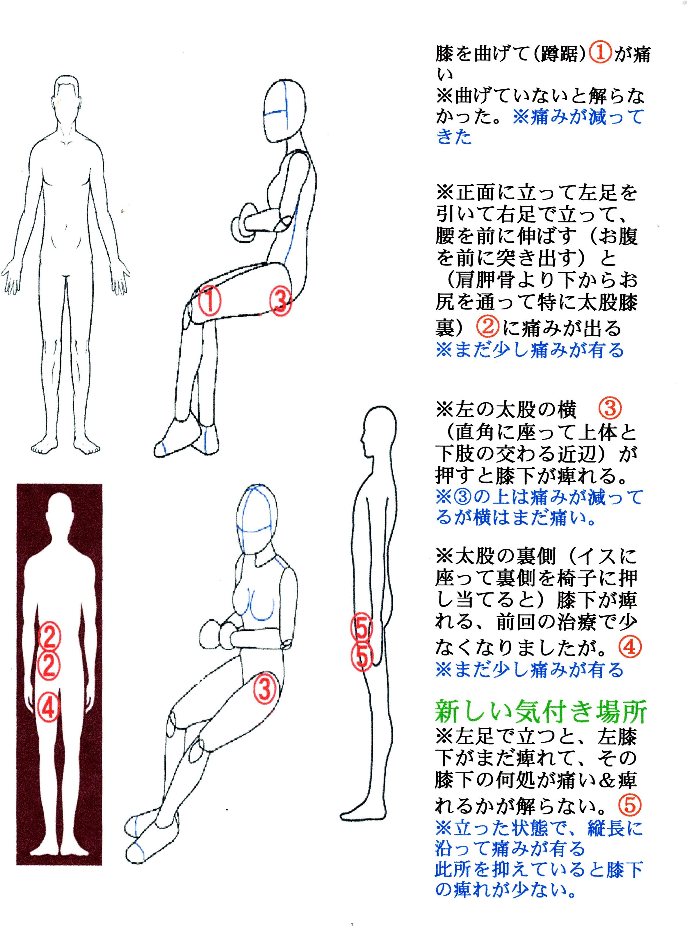 パートナーさんが付き添いで、今日も治療に行って来ます。今回で9回目になりますね。フォメーションサークルのレッスンもラテンアメリカンのグループレッスンもず~~~とお休み。パートナーさんにも迷惑かけっぱなし。今日は集中的に1ヶ所を治療して頂こうと思っています。※そして、新たに見つかった場所 背骨側の腰からお尻にかけてが特に痛い。 ①の体勢で膝下の内側が、まだ痛い。