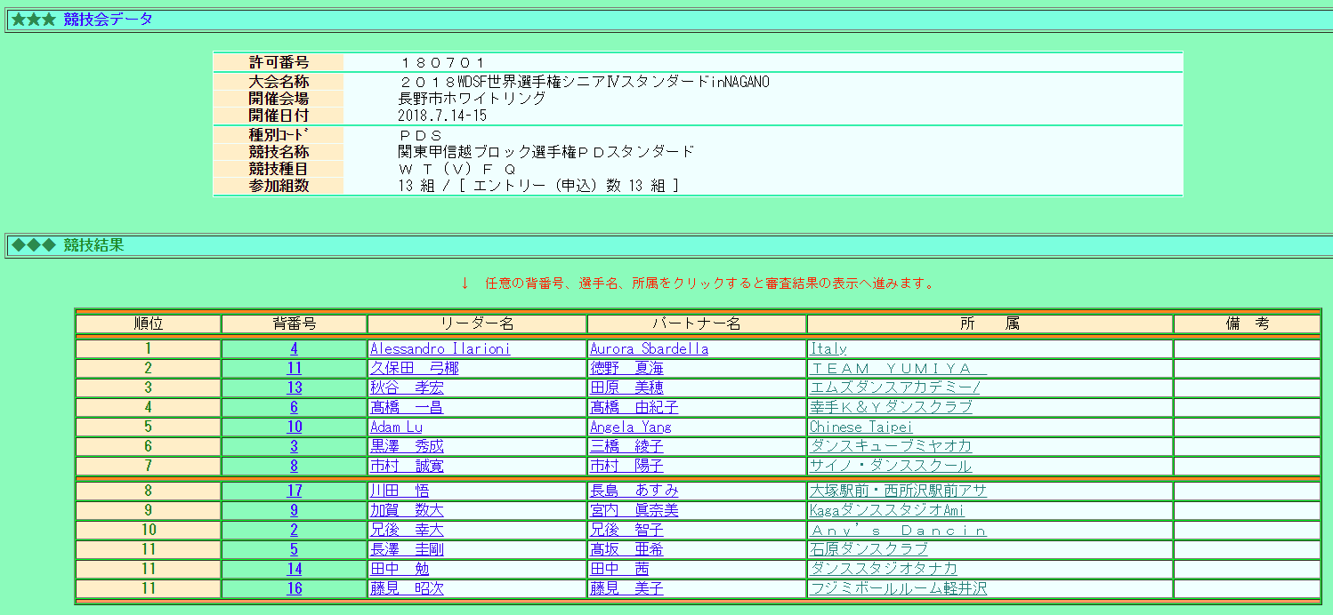 7月14日・15日 関東甲信越ブロック選手権PD2018WDSF世界選手権シニアⅣスタンダードinNAGANOWDSFオープンシニアⅢスタンダード(兼全日本選手権)全日本選手権シニアⅢラテンWDSFオープンシニアⅣスタンダードWDSFオープンアダルトスタンダードWDSFオープンシニアⅠラテンADSFアジアンオープンが有りました。KAZU&YUKI組は 関東甲信越ブロック選手権PD スタンダードに出場しました。結果は4位でした。皆様の応援ありがとうございました。唯、不思議なことが有りました。関東甲信越ブロック選手権PD関東甲信越ブロック選手権だけど、イタリアの選手が1位、2位久保田組、3位秋谷組、4位でした。5位の台北(中国)選手には勝てた。海外の選手が、関東甲信越ブロック?に出場。まぁ海外の選手とも競えて良い事だけど。ラテンアメリカンも海外の選手が紛れ込んでいました?7月16日のWDSFPDOpenStandard/OpenLatinJPDSA“AsianWorldDanceSportFestival2018”WDSFInternationalOpenStandard/OpenLatinADSFAsianSeniorLationChampionshipsユース10ダンス選手権(WDSF世界選手権代表選手選考会)は海外の選手の混ざり、KAZU&YUKI組セミファイナルに残っていました。WDSF-PDは3位・石原組、5位・オレクシー組、10/11位・喜多田組・山嵜組、12/13位・壺内組にKAZU&YUKI組。アマチュアシニアに出場のキンタロー。&ロペス組と記念写真。