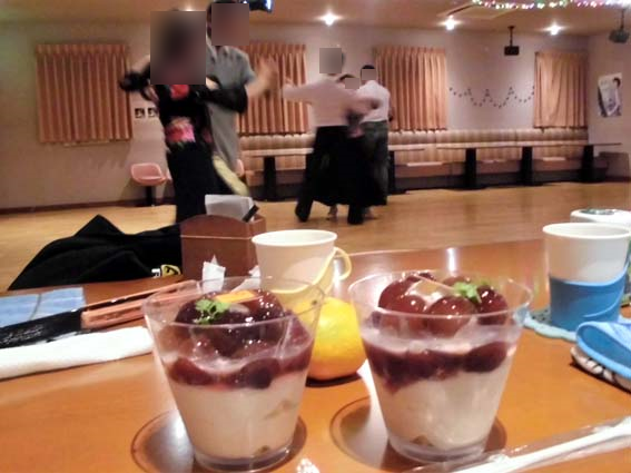 お疲れの時は、果物に甘いもの。パートナーさんの持ち込み(ご馳走様でした。)お気に入りのケーキ屋さんの葡萄のケーキ美味しかったのですが、ブドウの種が邪魔だった。種なしが良かった。皆さんが踊っている中、美味しく頂きました。ご馳走様でした。