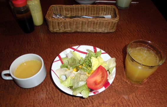 コーンスープにサラダとジュースキノコのトマト仕立てのパスタご馳走さま~。