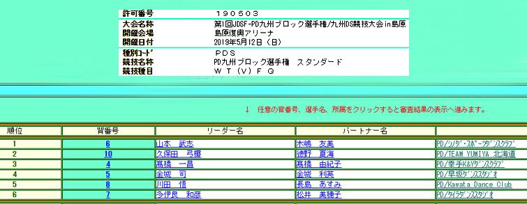 2019年5月12日(日)2019年島原市長杯第1回JDSF-PD九州ブロック選手権優勝 山本 武志・木嶋 友美組第2位 久保田 弓椰・徳野 夏海組第3位 高橋 一昌・高橋 由紀子組第4位 金城 司・金城 利英組第5位 川田 悟・長島 あすみ組第6位 多伊良 和彦・松井 美穂子組我が幸手K&YダンスクラブのKAZU&YUKI組は3位でした。応援ありがとうございました。