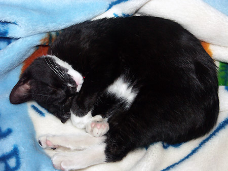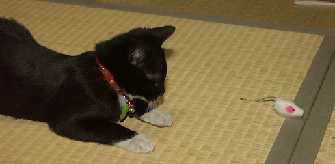 目下のお気に入りは、ネズミの形をしたおもちゃ。何でも、猫用に特別に開発したとかで、使っている毛は本物のネズミのもの、形、大きさは度重なるテストの上で決定したという、テストされた猫もいい迷惑というか、、何ともはや、、、これを作った人は、商売抜きで猫好きなんだなと。。その甲斐あってか、狂ったようにじゃれます。疲れを知らないというか、放っておけばいつまででも遊んでいます。ちょっと膝の上からおろして、ほかの事をしたいときなど、これをポンと投げてやれば、それこそ脱兎のごとく飛びついて、便利と言えば、便利。ただし、目の前をかけずり回るのは我慢しなければなりません。もういっぱい遊んだから、眠いのかな。。
