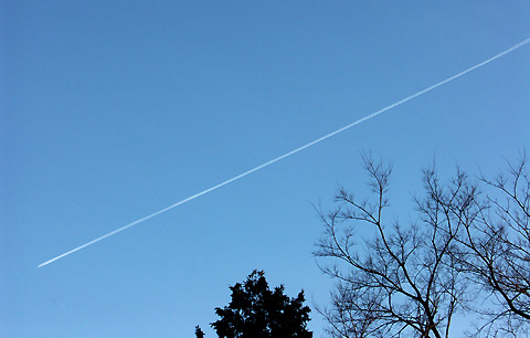 羨ましいくらいに晴れ上がった青空を、まっすぐに雲の尾を引いて、音もなく飛行機が横切っていきました。北風が大暴れしてる下界を知ってか知らずか、何処から来たのか何処に行くのか、悠々と飛んでゆきました。遠くへ行きたい。