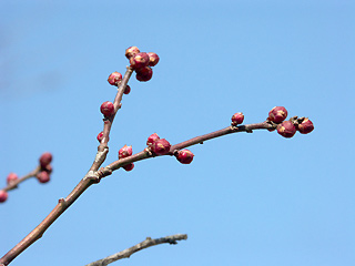 梅の梢が、遠目に何となく色づいて見えました。いつの間にか、だいぶ膨らんでいるようです。