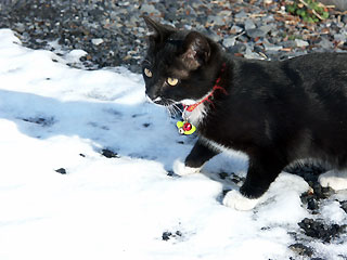 何だ? 今日は真っ白だぞ。。冷たいっ!でも歩いちゃえ!ひゃあ! やっぱ冷たい~あ~びっくりした。。*****************************はじめて見る雪に、驚いたようでした。雪の中、元気に走り回って帰ってきて、泥の足跡をあちこちに残してくれました。掃除が大変。。雑巾もって、追いかけ回していました。。
