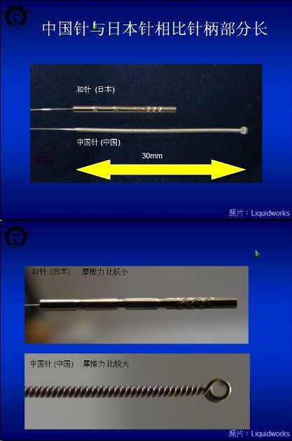 ▼中国では刺入後の「得気」や「補瀉手技」を大切にします。したがって、刺入後に激しく操作するため、その形は手指との摩擦が得やすいように独特に進化しています。当然、細過ぎれば操作時に針体が曲がってしまいます。