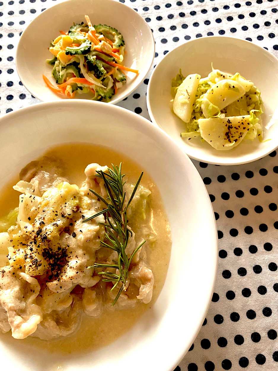 豚肉とキャベツのクリーム煮、ハム卵キュウリサンド