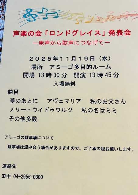 アミーゴで声楽の会「ロンドグレイス」発表会があり、3曲独唱しまし…