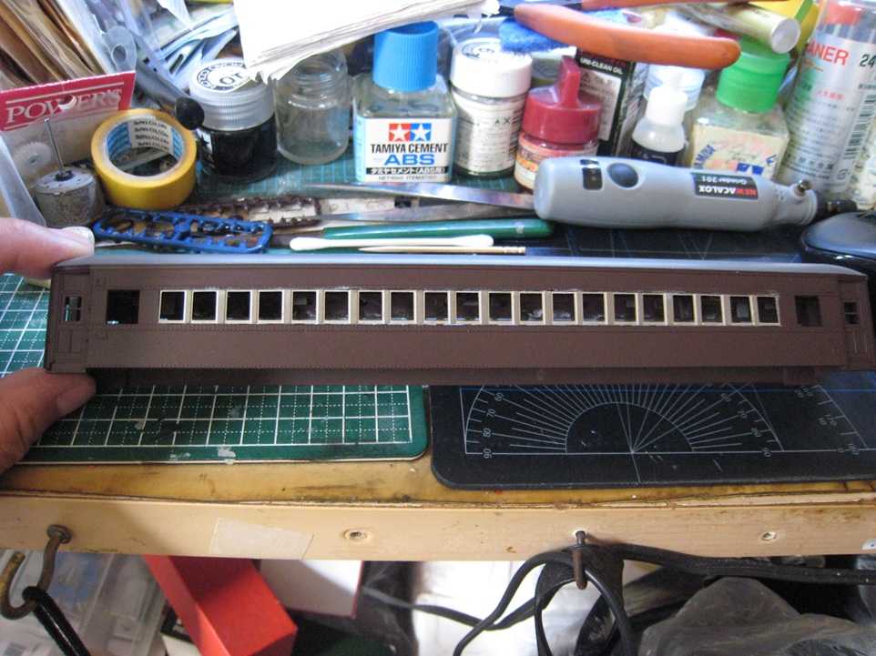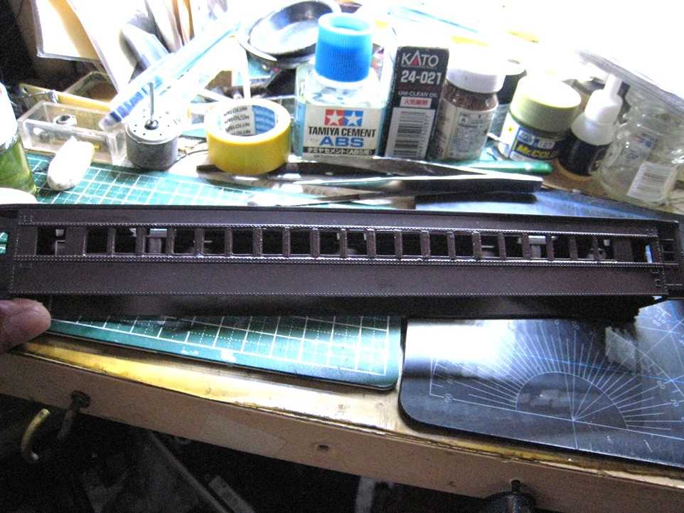 16番 KATOオハフ33からスハフ32への改造 窓貼り接着、プライマー