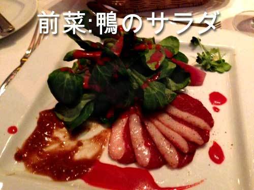 クリスマスパーティでの食事。前菜鴨サラダ,マロンクリームスープ,メ…