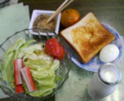 今朝の朝食はトースト、サラダ、ゆで卵。牛乳でした。じゅんぺいのは…
