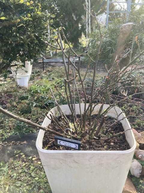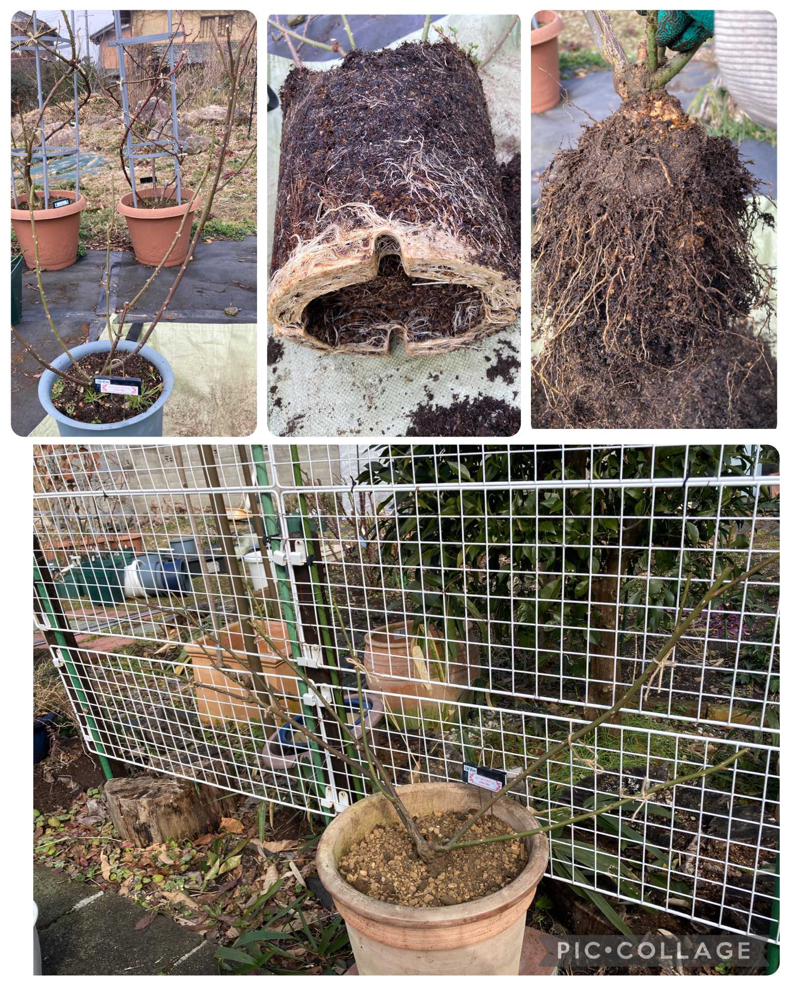 冬の鉢増し植替え作業 中鉢とオベリスク仕立て