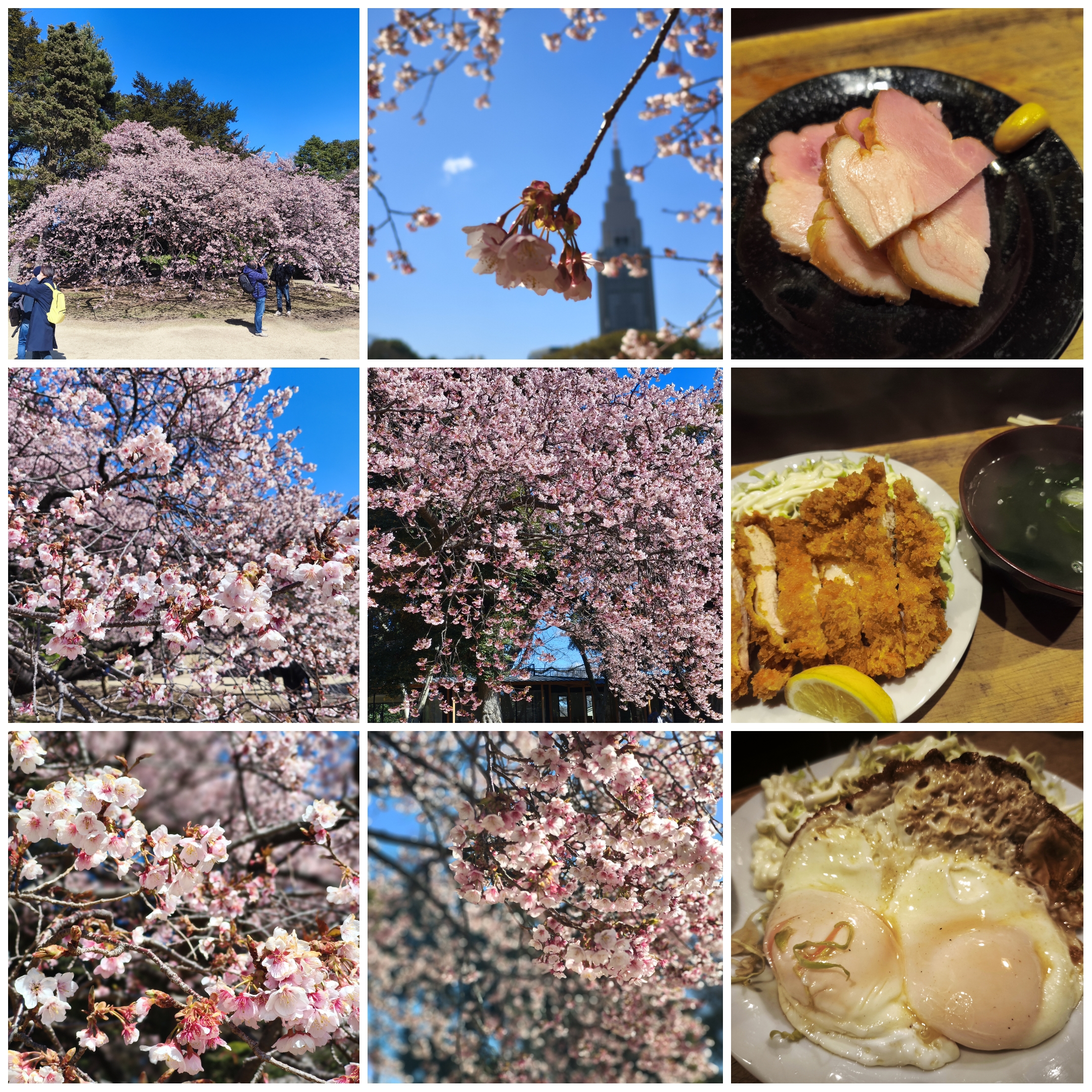 祝日仕事→新宿御苑サツマカンザクラ→花粉症にはビタミンD→近所の居酒…
