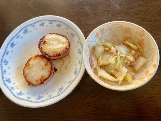 昼食は、焼きはんぺん・白菜・胡麻ドレッシング。 梅ゼリーも。クエ…