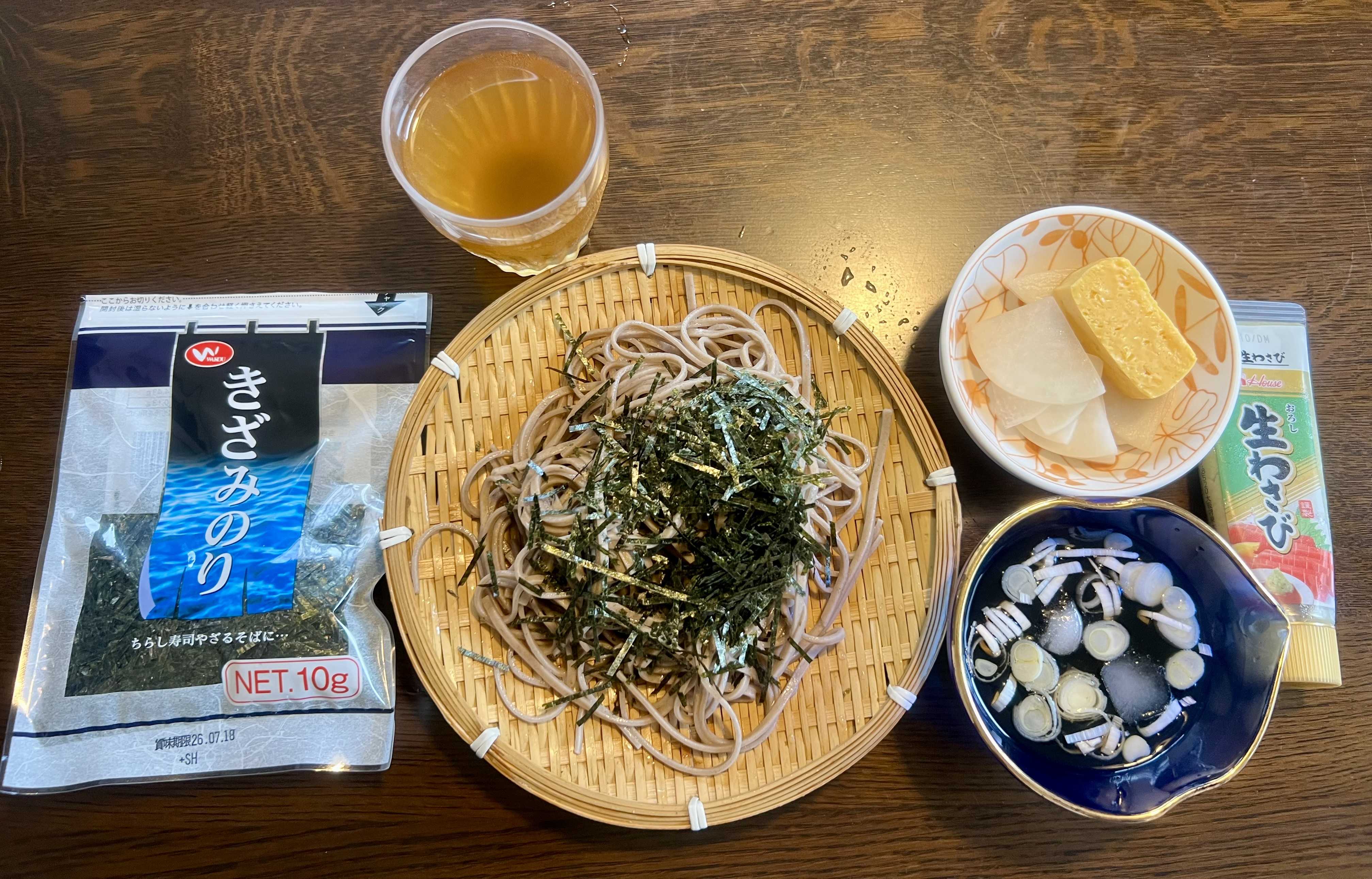 昼食は、ざるそば(蕎麦・刻みのリ)、めんつゆ・葱・山葵、卵焼き、大根の酢漬け、麦茶。夫は、海苔無し…
