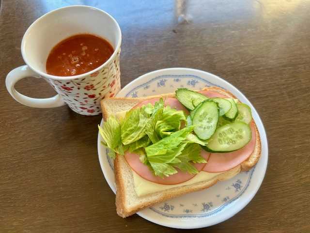 昼食は、ハム・チーズ・胡瓜・セロリの葉トースト、野菜ジュース。夫…