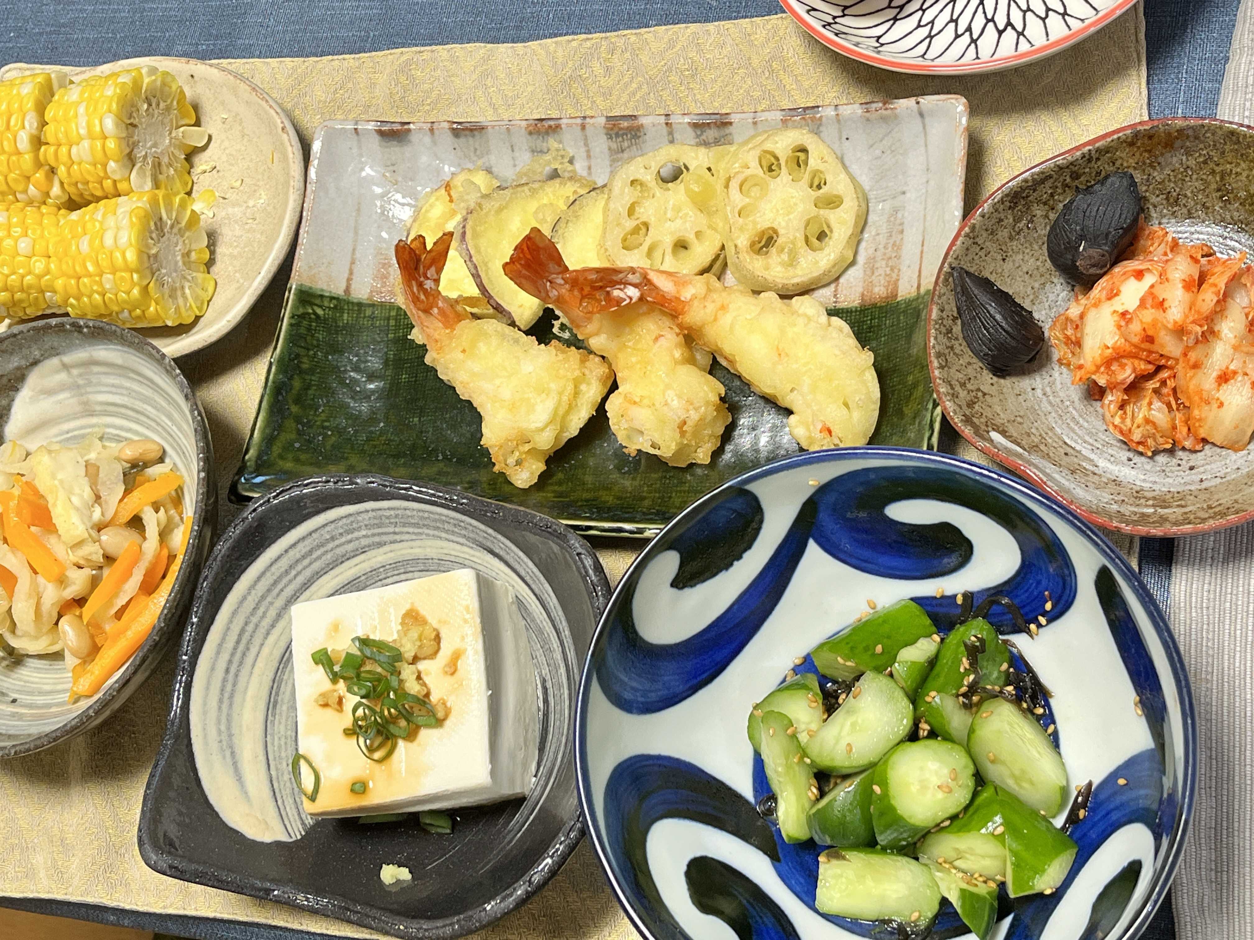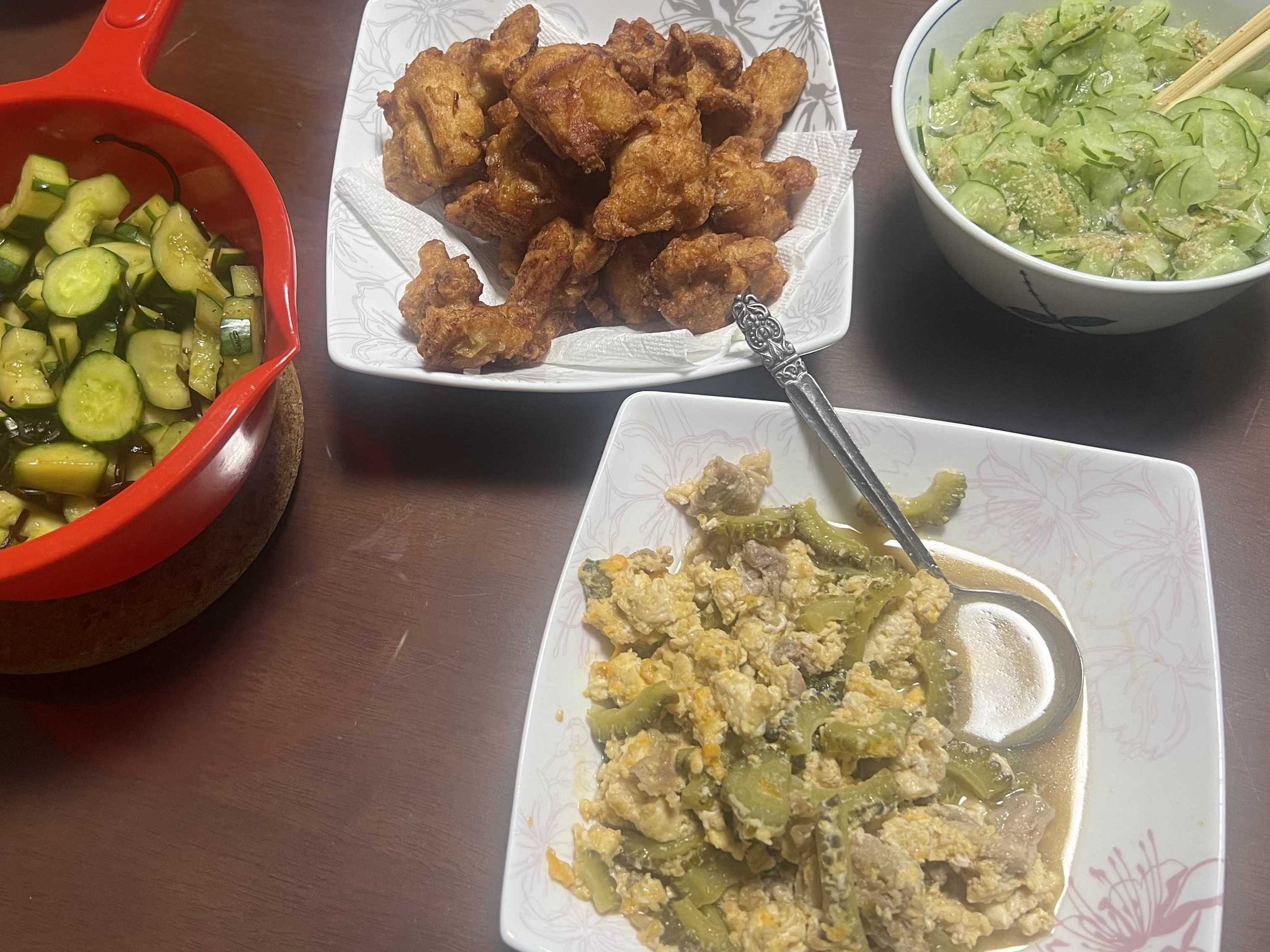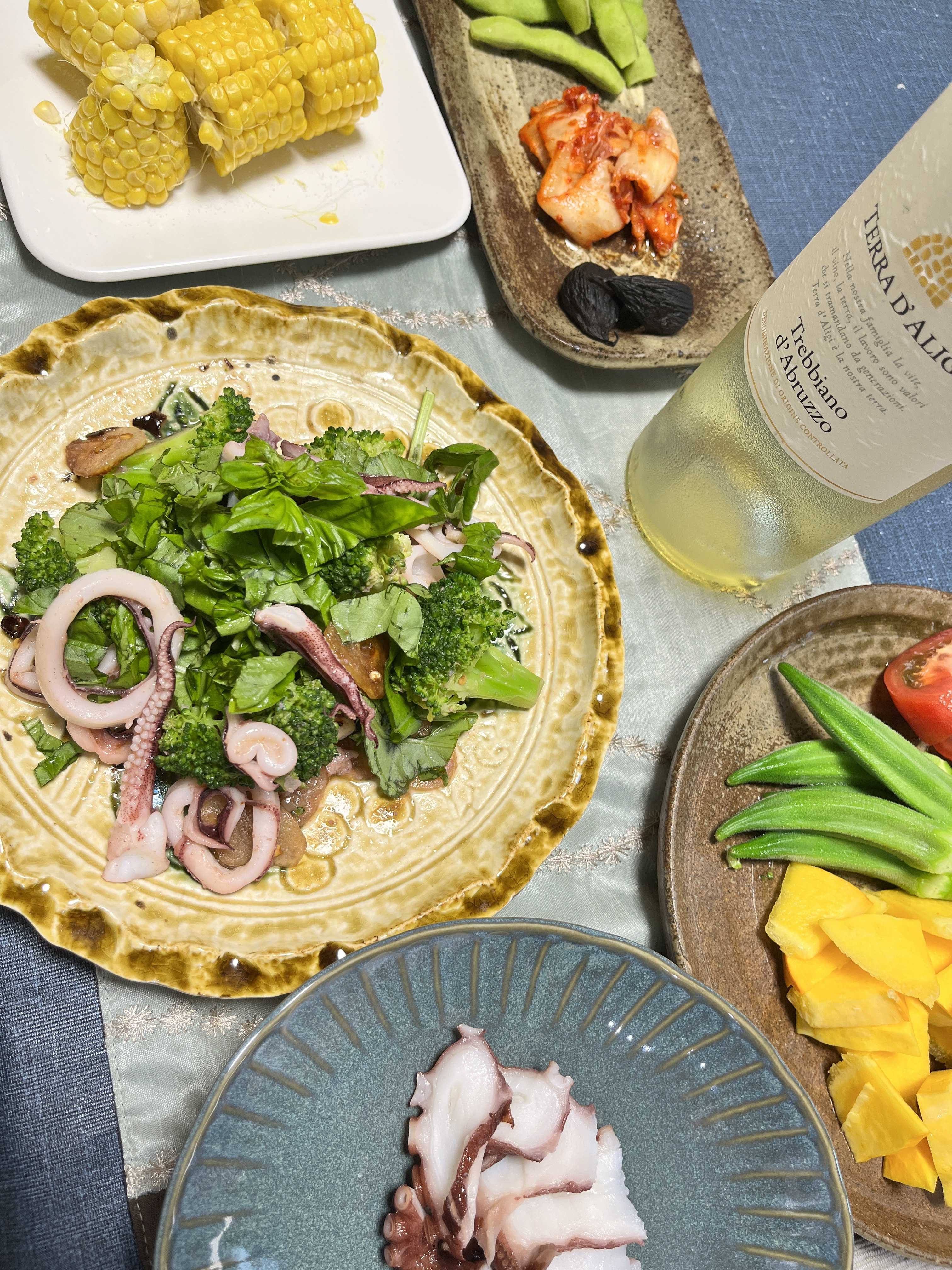 夏野菜の饗宴🥰この暑いなか、イカ炒めの鷹の爪が効きすぎてさらにHO…
