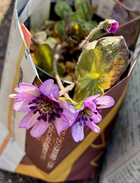 今日のコーディネートは紫・緑・黒・グレー系。雪割草の私のイメージ…