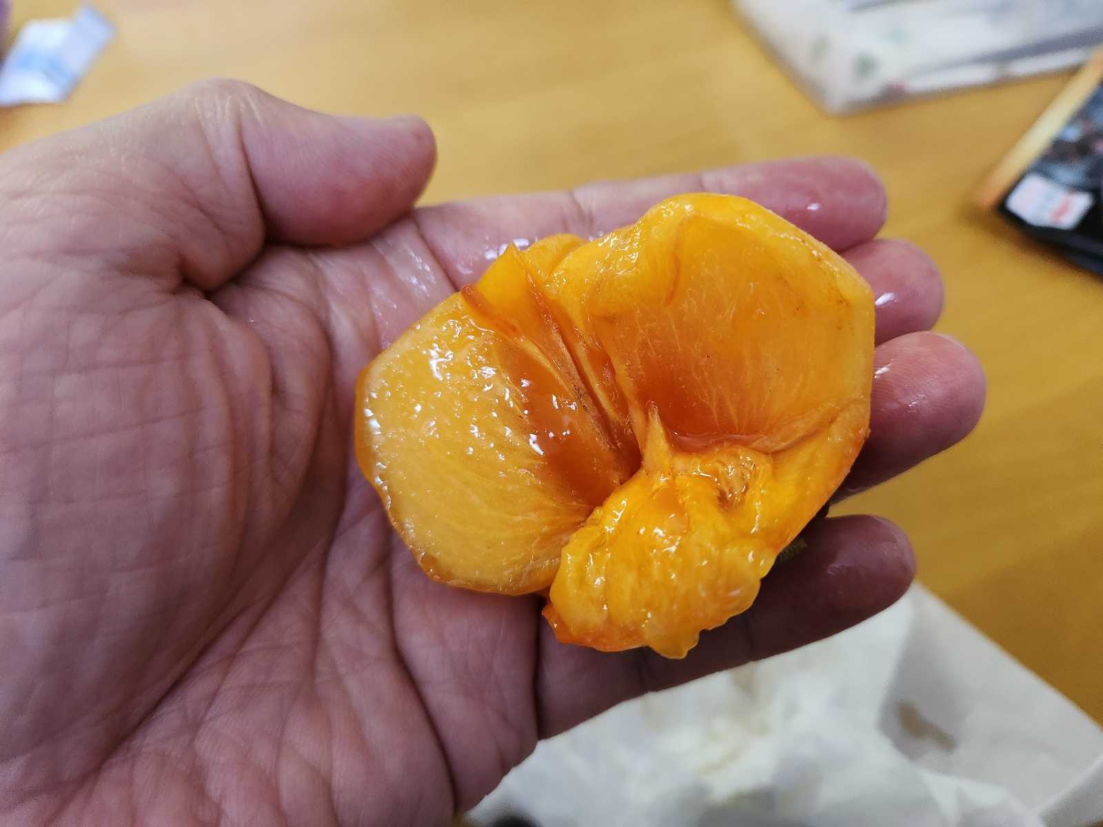 うちに生った柿2個。先々週シブ抜きをしてたのでした。