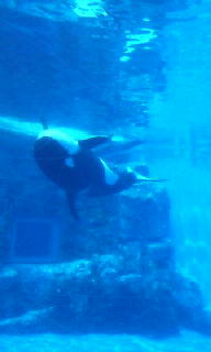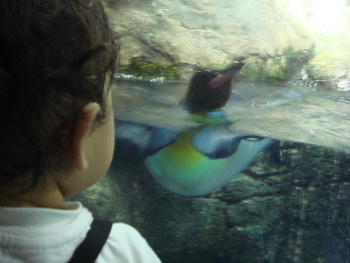 今日は、おチビを水族館デビューさせてきました最近、魚を見ると「とっと」と言うようになったおチビ。(ちなみに、イルカもクジラも「とっと」と言いますが・・・)入り口入ってすぐのイルカ達&シャチのクーちゃんに大興奮クーちゃん。体重3トンだって。イルカのショー&クーちゃんのトレーニングショーをノリノリで見てくれました。イルカ&シャチの次に興奮したのが、イワシの群れ。「まんまぁ~!!!」と言って、食べる真似をしてました・・・たしかに、イワシの丸干しをよく食べますが・・・よく同じ魚と分かったな、と変に感心。カサゴを見ても「まんまぁ~」と言って食べる真似をしていました。確かに、週末、カサゴを煮て食べましたけど・・・。彼の中では魚=食べ物と認識されている模様です。最後にペンギンを見たのですが、反応はイマイチ。すっごく寒々しい画像になってしまった・・・すぐに「ばいば~い」と手を振って、水槽から離れちゃいました。ショーを含め、約3時間の滞在でしたがおチビには楽しい刺激がイッパイだったみたいです。帰りにクーちゃんのぬいぐるみを買ってもらって、家に着いたとたん爆睡モードに入ってくれました私も10数年ぶりに水族館に行って、新鮮で楽しかった~ベルーガの赤ちゃんが、めちゃめちゃ可愛かったですよ