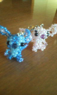 最近、寝不足で、身体のしんどさがピークに達したので今日は実家へ帰って、お昼寝をさせてもらってきました。お昼ご飯を食べて、私は1時間熟睡は~。久しぶりにぐっすり寝たわ~。いくら同居中の義父母と仲良しでもさすがに「寝不足でお昼寝したいので、預って下さい」とは言い辛いので、こういう時はやっぱり実家ですねさて、とにかく、おチビがスティッチ大好きだということで母が得意のビーズで、こんな可愛いストラップを作ってくれました。分かるかな~!?スティッチとエンジェルです。おチビ、大喜びで振り回しております。いつ分解されちゃうかと、ドキドキです