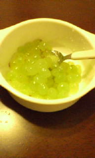 ちょっと前まで、大の桃ブームだったおチビ。最近は、ブドウブームに変わったみたいでお買い物に行くと、必ず1パック(3房入り)を買わされます。で、桃と違ってブドウは食べさせるのが大変自分で皮をペッと出すなんてことできないので1房分、全部皮をむいてから食べさせるんですが・・・このような状態にしたところをおチビはスプーンでモリモリと食べていく訳です。私、ブドウむき職人になれそうです。