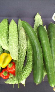 我が家のゴーヤ、きゅうりの場所まで占領してツルをのばしています。そして、まだ花盛りです。ここのところ、1日に5本ずつくらい収穫できるんですが家族みんなちょっと食傷気味で、収穫しても食卓に乗らず母家とうちとで、キッチンの飾りになっています。義父が、乾燥させてゴーヤ茶を作ってみたもののあまり美味しくないので、誰も手を付けず・・・。う~ん、一体いつまで実がつき続けるんだろう???ちなみに、本日の収穫はこちら。パプリカが、綺麗に色づき始めました。甘くて美味しいですオクラも欲しい時に欲しい分だけ収穫できるようになってきました。(写真には写ってないけど・・・)夏野菜の時期が終わったら、ゴーヤの来年の処遇を考えなくては。ネットに這わせておくと、日よけになって涼しいからイイんだけど増え過ぎなんだよね~・・・。