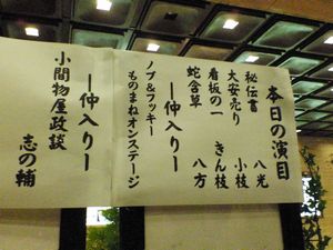 いつも会場はお江戸日本橋亭。「有望若手応援寄席」のチラシ挟み込みがOKだったので、「挟み込みの作業時間」を見込んで開場時刻の2時間前に着くようにしましたがまだ誰も来ていませんでした。食事で時間調整して17:00に再びお江戸日本橋亭に行ったら、ちょうど「好二郎さんご一行様」が車で到着したところ。チラシは受け取った橘也さんたちが他のチラシとまとめて織り込んでくれるというので、入り口前の縁台に腰掛けて奥さんが来るのを涼みながら待っていました。奥さんはお江戸日本橋亭は始めてなので携帯メールで神田駅からの歩き方(曲がる角の指示)を送信。 <きょうの出演者と演目> 18:50~ 三遊亭橘也 「新聞記事」 19:01~ 三遊亭好二郎「殿様と私」 19:26~ 立川談修 「蟇の油」 19:49~ 三遊亭好二郎「あくび指南」 20:19~ 中入り 20:29~ 三遊亭好二郎「へっつい幽霊」 21:00終演「あくび指南」に入るマクラで好二郎さんが話した「プロより上手い素人が存在するのは落語の世界くらいなもの」「上手い素人をプロには引き揚げない」という指摘は、かなり秀逸な視点だと思いました。
