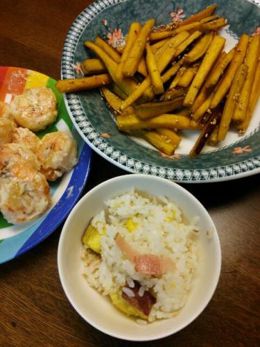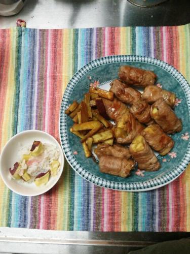 ゆうくんのおいもほりから1週間。今度はほのちゃんの番。大きいのを1本掘ってきてくれました。ほのちゃんもおいもごはんがいいと言ったのでおいもごはんとさつまいもの肉巻きにしてみました。さつまいも今年は豊作だったようです。今まで小さいお芋しか見たこと無かったので・・・ほのちゃん、また来年も頑張ってね。
