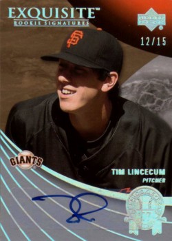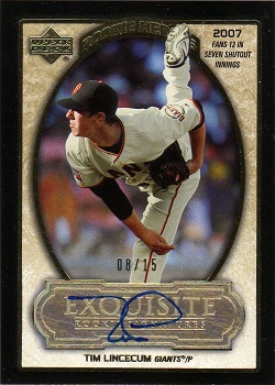 | 07 UD Exquisite Rookie Signatures Rookie Heroes Autographs Gold #TL1 Tim Lincecum /15 |