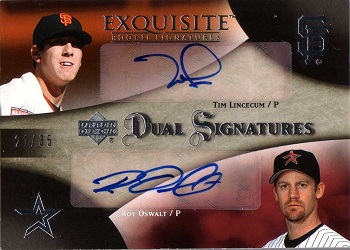 | 07 UD Exquisite Rookie Signatures Dual Signatures #DS-LO Tim Lincecum / Roy Oswalt /35 |