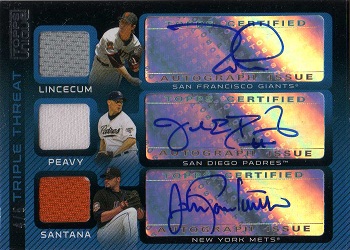 | 09 Topps Unique Triple Threat Autographed Relic #TTAR-LPS Tim Lincecum / Jake Peavy / Johan Santana /5 |