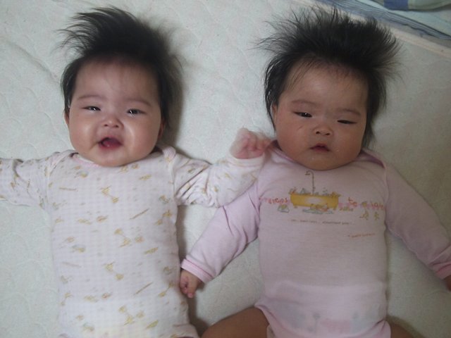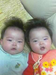 家の双子ちん・・・実は女の子に見られた、ためしがないのです。うっすら気付いてはいましたが・・今日、又、男の子?と聞かれてしまいました・・パパなんかはもともと男の子希望だったこともあって、双子にいつも「おまえ達はどこに ち○ち○ おいてきちゃったんだ~~!!??」(ごめんなさい下品で・・)なんて言ってます・・。まあ仕方ないんですけどね・・確かにおっとこ前な顔ですから・・でもね・・人に聞くときはどんなに男前でも「女の子ですか?」って聞きましょうね・・。ええ~と話は変わりますが私は良く長女ぽんに双子のうちの片方を連れてきて~と頼みます。ぽんは確実に2人を見分けて連れてきてくれます。ところがここ2、3日・・・・。間違える、間違える・・・・どうやら、こと の髪が上に向かってきているようで・・・。確かに見分けづらい・・。この間見分け方を日記に書きましたが通用しなくなりつつあるようです・・。違いは かなの方が若干顔が大きい・・・。女の子なのに・・これも不憫です・・。皆さん違いがわかりますかね?