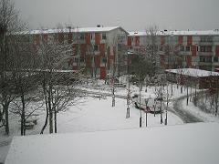 なんか今日は冷え込むなぁ、、、ぶるぶるっ、と思っていたら、昼過ぎからちらちら雪が舞い始め、ランチに出かけた帰りにはもうすっかり降り出しておりました。今年の初雪です。分厚い手袋と帽子も歯がたたないほど寒いけど、へへ~、なんかうれしいかも♪スウェーデンの人たちは、ルンドを含めここ最南端のスコーネ地方の冬は、雪があんまり降らなくてつまんない、とよく言ってます。雪が降ったほうがいい理由がいくつかあって、見た目にきれいなことのほかに、雪が降ったほうが積雪の保温効果(かまくらの中、みたいなもん?)かあったかく感じることと、夜になってもまわりが雪でまっ白だと明るく見えること。スコーネはあんまり雪が降らないから暗くなるとほんとにまっ暗だし、降ってもぼた雪で、雪の多いウィスコンシンの Becky やカナダの Erin はこんなにベタベタな雪やだー!と文句言ってたりもして。あと、冬の雨だと寒くて冷たくてしゃれにならないけど、歩いてて雪まみれになっても室内に入る前に服にびっしり積もった雪を払い落とすだけでいいからラクチン♪こっちの人も慣れたもんで雪が積もりだすとすぐに除雪車が出て、自転車や歩行者用に道を確保してくれます。まぁそれにしても自転車に乗るときは気をつけなくちゃ。昨年わかってなくて雪道を自転車で走ろうとしたら何もないところでコントロール利かなくなって深雪に突っ込んだし。。^^;;;;ひと晩あけたらこんな感じに。窓の外を見ると、駆け足で秋が過ぎてすっかり葉を落としてしまった木の枝が今度は雪化粧されてます。修論と格闘してる間に暗黒の11月ももうすぐ終わり、クリスマスまで1ヶ月を切りました。楽しみ~~(*^_^*)