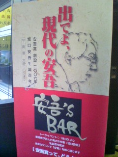 定期的にイベントを行うここネスパス。今回は、新潟市が生んだ大作家・坂口安吾生誕100年を記念し、かつ新潟市が政令指定都市になった記念の合併記念事業として設立された安吾賞創設を盛り上げるための集会およびイベントでした。地下では、お酒が好きだった坂口安吾に因んで、安吾'S BARなるブースを設け、初披露の日本酒を片手に、トークショーや語らいのひと時を持つ仕掛け。
