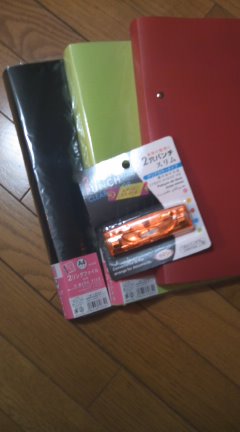 こんばんは。えっとー 今、パソコンの画面がおかしなことになってます。文字の大きさが変だったり表示が左に偏っていたり…。んー直し方がわからん。→次の日立ち上げたら直ってました!(なんだそれ!)学校の授業はますます専門的な話が多くなり、時折ついていけなくなってますが(オイ!)何度も同じ話をしてくれるそうなので段々理解を深めていけばいいかな?なんて考えてます。医療関係は一度聞いただけでは理解できないことが多い!で学校ってノートをとったり資料をもらったりとワタシにとってはかな~り懐かしい作業があるのですがそうなるとやれノートだ、ファイルだ定規だと必要なものが毎日増えてここのところ1週間に1回は確実に100均通いです。えぇ、すっかり常連さんです。幸いなことにウチの比較的近所に売り場面積の大きな店があるのでそこに行ってます。おととい寄ってきましたが、目当てはファイル。紙資料を沢山配布しますとのことで果たしてどんなファイルにしたらよいやら。パッチンとはさむタイプにするか、(グっと金具を押して留めるタイプのことです)それとも2穴リングにするか2穴のスライドで留めるタイプにするか…ありすぎて迷いましたがとりあえず2穴リングで別に30穴の透明ファイルを買い、資料はファイルに入れ保存することに。でも一応スリムタイプのパンチも。今ってこんなに小さいの?って位の小さいパンチがあるんですねー。ちょっとわかりにくい写真でスミマセン^^;ファイルがA4を少し大きくしたと思っていただければ大体わかるかな?ノートは今のところ1冊ごとに分かれているものですがこれからのことを考えるとリングファイルにしようかなと…。う~ん…勉強自体が久しぶりで整理の仕方で悩んでます…。