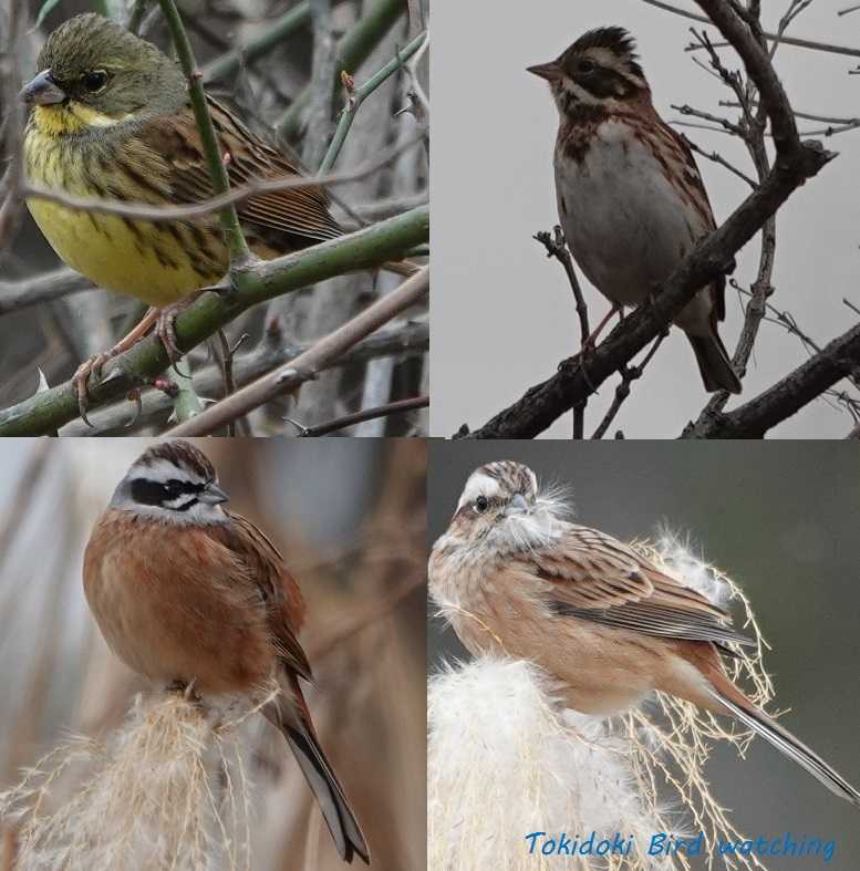 ホオジロ系を3種で上段アオジ、カシラダカ、下段ホオジロ♂、♀。