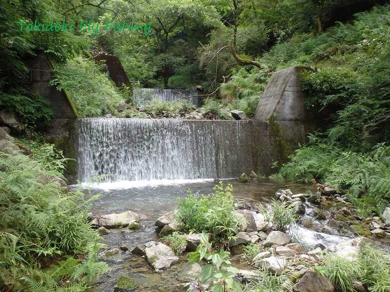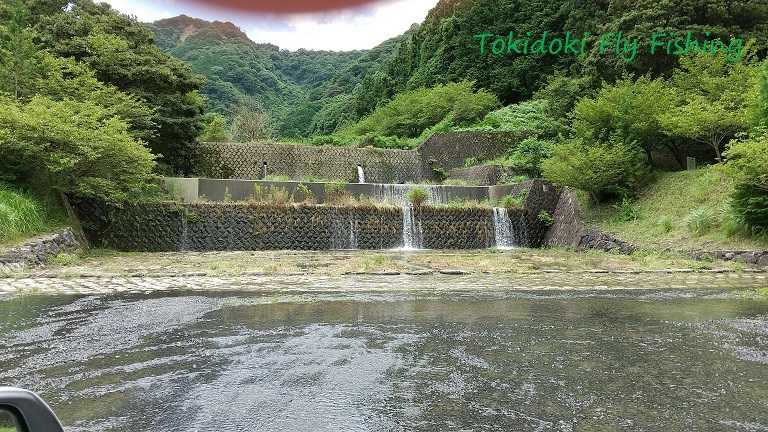 普段は流れが無く手前の濡れたところは駐車場で、上の写真のアマゴが釣れたのはここから歩いて10分ほどの堰堤下でした。