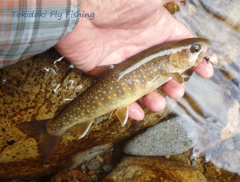 昼食後に「さあ、再開!」と目の前の流れの巻きに目をやると、7寸ほどのイワナが向こう向きで定位しています。