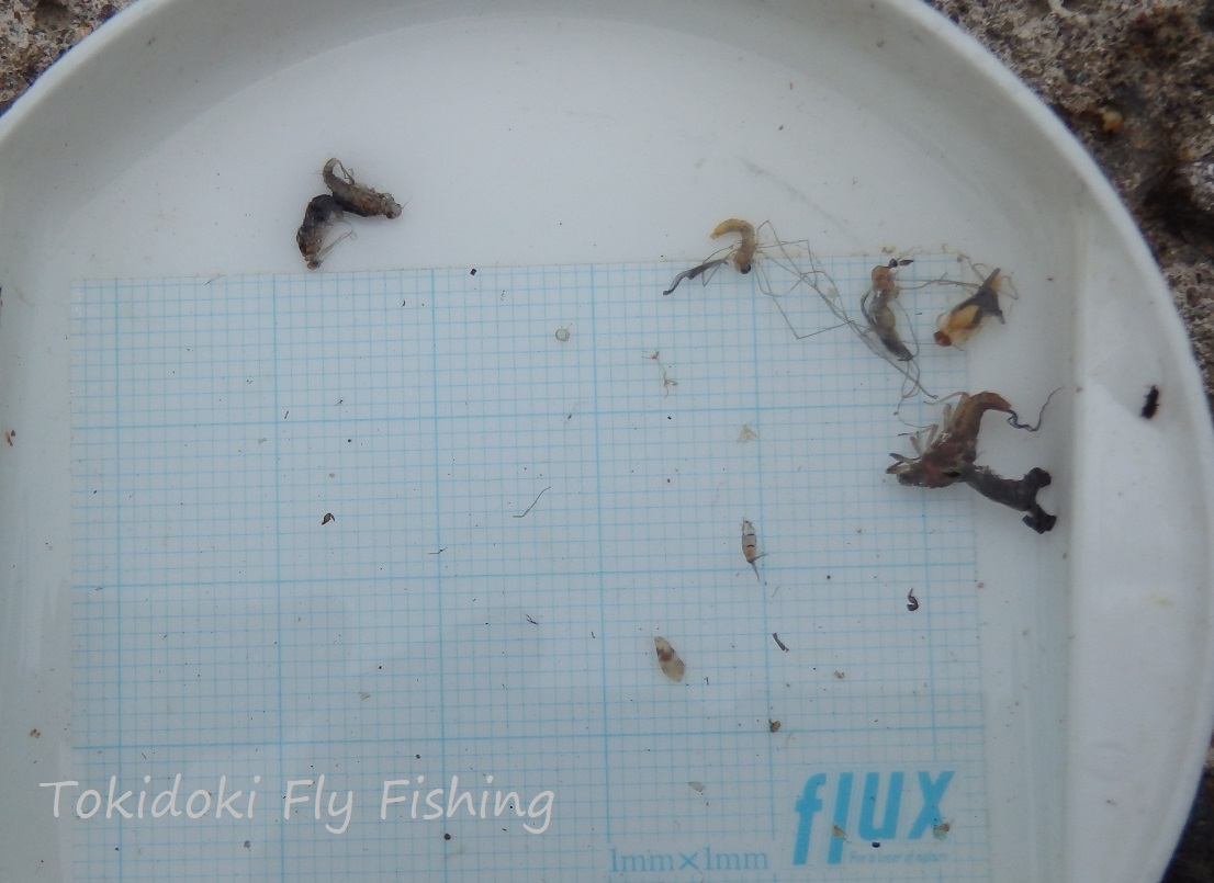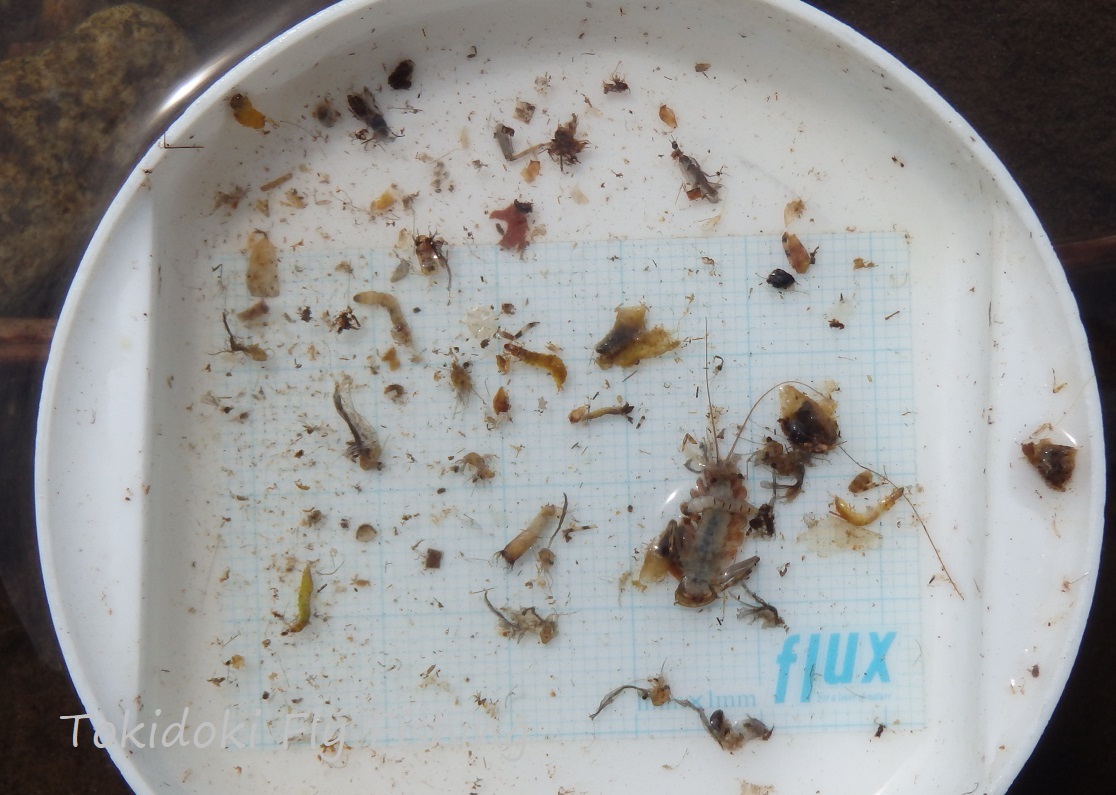 魚が小さいので迷ったけどライズしていた魚なので採ってみたらアカマダラとガガンボが出てきた。