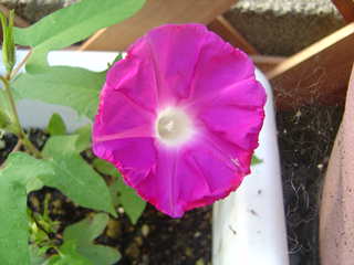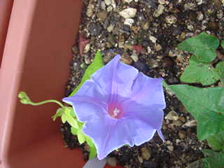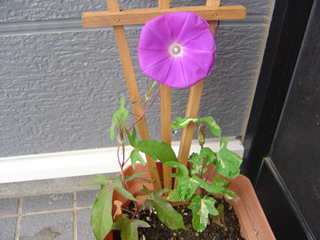ずっと待っててやーっと咲きました。コレ撮ったときまだ1つだったんだけど夕方見たら2つ目も開いてました。ららは『しまぁり(ひまわり)咲いてる』ってご機嫌に眺めてました。いまいちだけど 桔梗咲きあさがおも咲きました。ついでにホリホック第三号・・・うらに4号も咲いてます。1号2号はお花終わってしまいました。さらについで・・・トルコ桔梗