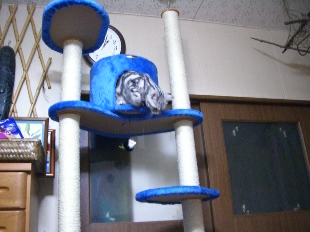 先日、お話しましたジーコの寝場所のことです。立派な寝床があるのに、寝てくれない↓↓なんとか寝てもらうために、いろいろな手を使っています。まずは、綺麗な所が好きなので丸洗い(2回目洗濯)をしました。で、慣れてもらうためにキャットタワーに干してみました。↓↓↓↓↓ 大丈夫かにゃ~。というより、干す場所がなかった・・・。2~3日後、うちの旦那はというと、、、、「ジーコちゃ~ん。ね~んね。ねんねでしゅよ~♪」うっっ、猫バカである。。ところで、ジーコは??というと、しっかり寝ているではありませか~今では、眠くなると一人でも入っていきます。作戦成功でした!!